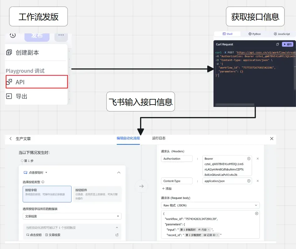 现在,开始进行飞书与Coze工作流的对接。Coze工作流制作并发布后,会形成一个API端点,可供外部系统调用。