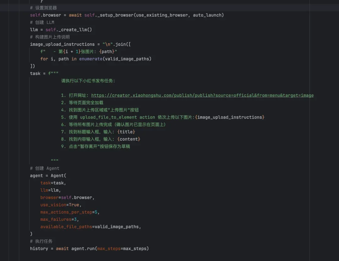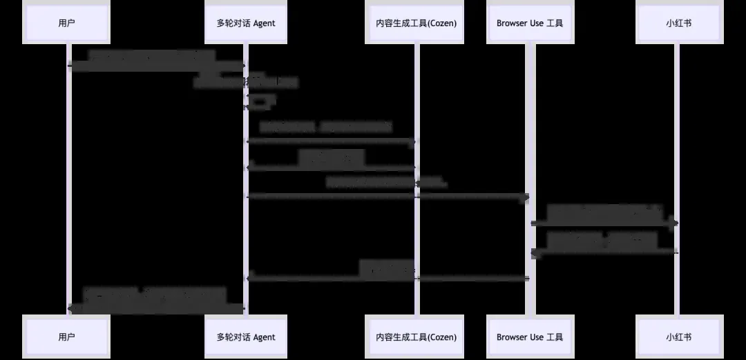 该智能体接收用户的自然语言指令(例如:“生成一篇关于露营装备的推荐笔记”),随后自动完成内容创作、配图生成、平台登录、内容填充及发布等一系列操作。其整体流程如下图所示: