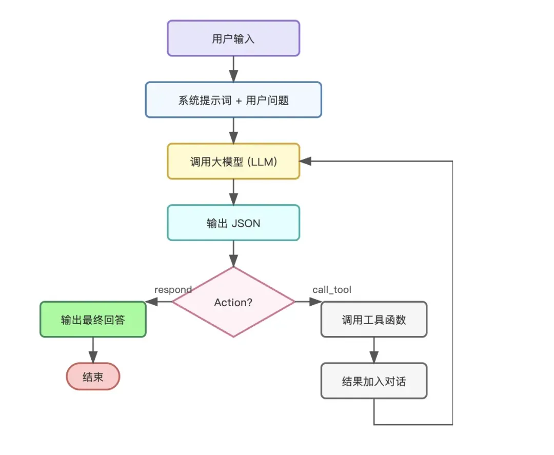 action是”call_tool”,则根据tool和parameters调用对应函数,将函数执行结果作为新的消息附加到对话历史中,然后再次请求AI。 - 如果