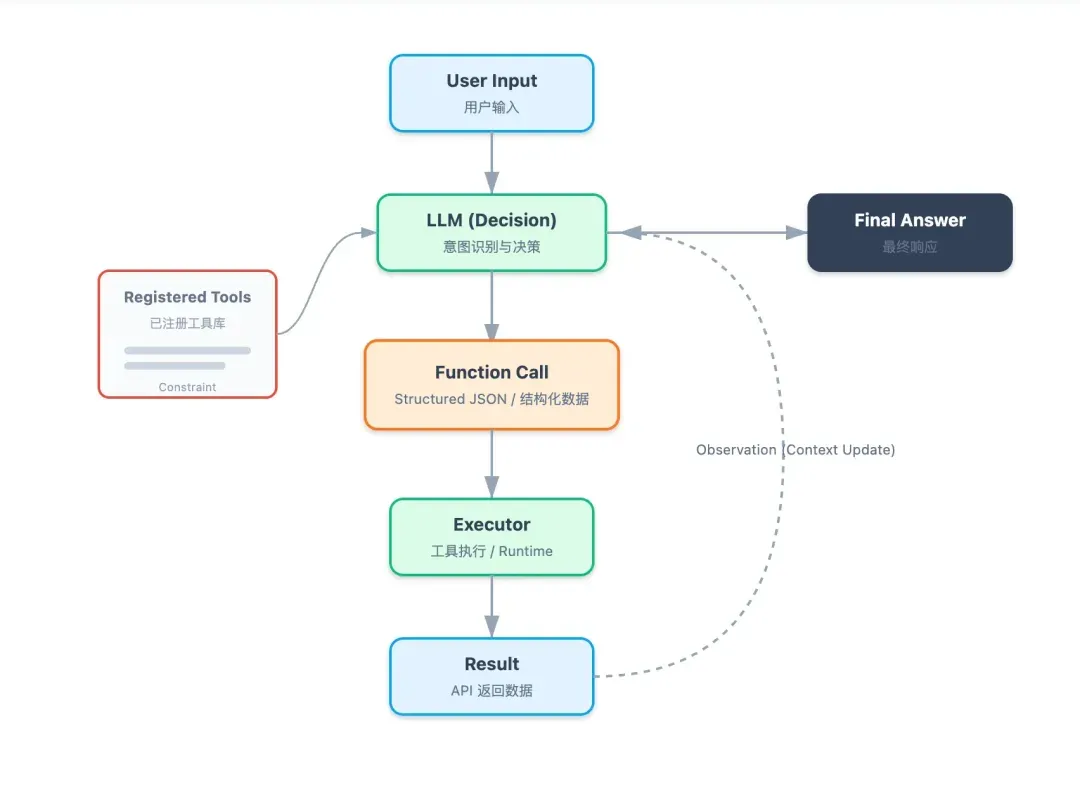 这里有一个问题:为什么需要JSON格式? 因为AI模型默认输出的是自然语言文本。为了让我们的程序能够精确理解AI的意图并执行对应的函数,我们需要AI以程序易于解析的结构化格式来输出其决策。JSON是目前最通用和友好的选择。当然,理论上XML或其他格式也可行,核心是“模型易输出,程序易解析”。