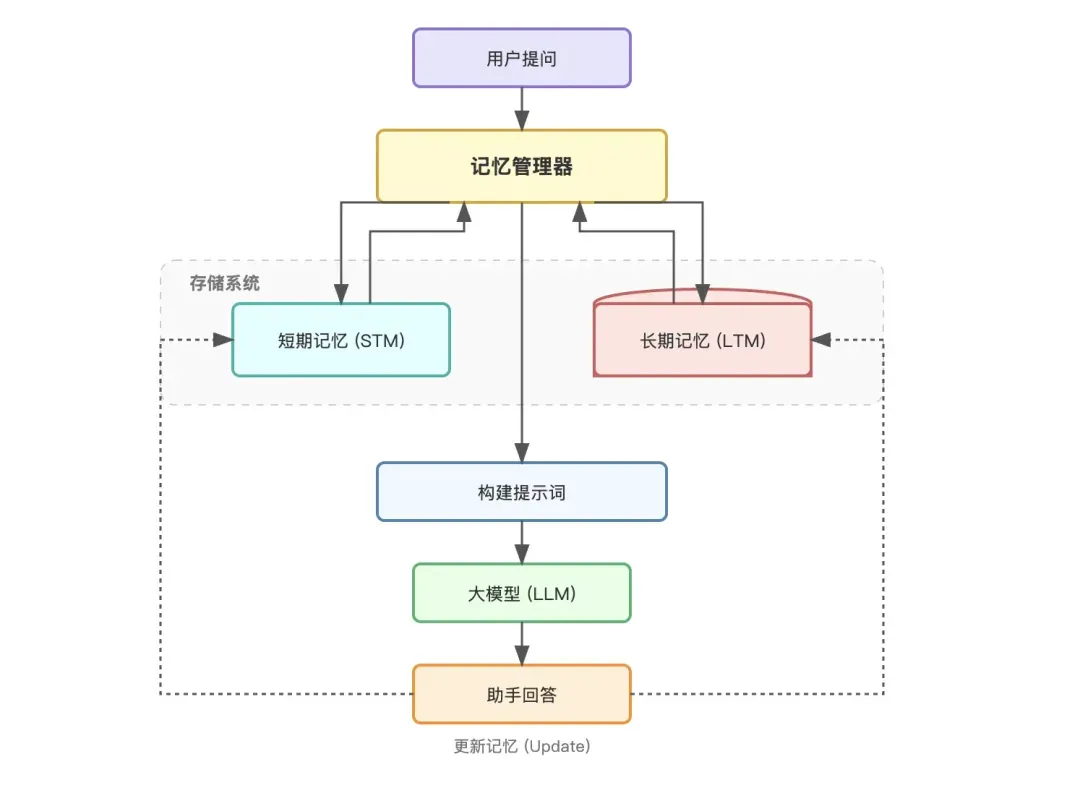记忆管理器负责协调两种记忆,并构建最终的对话上下文。